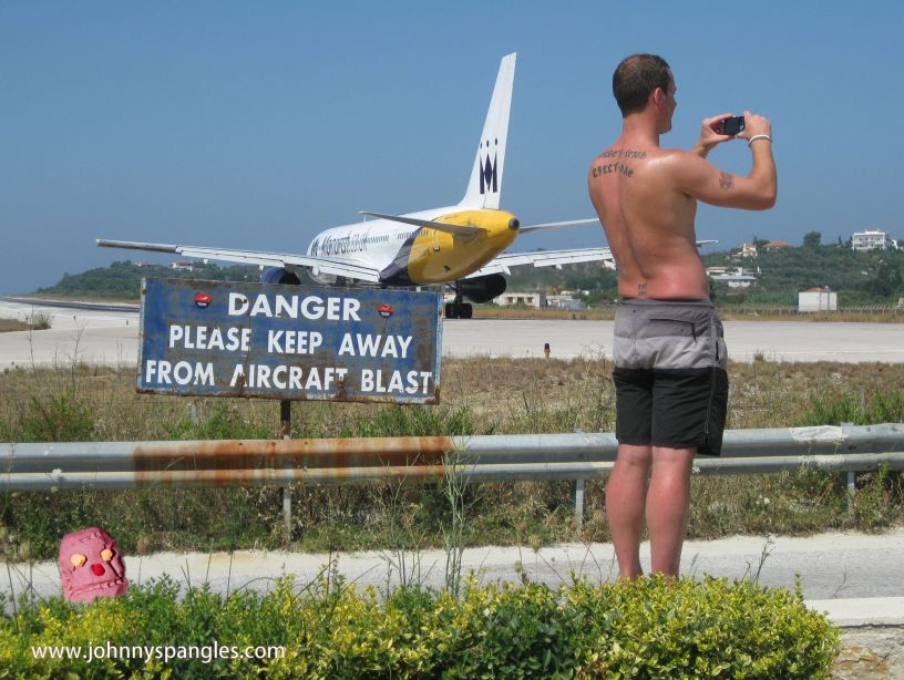 And jolly dangerous Skiathos Airport is too. Should you be in any doubt there is a sign at the end of the runway that tells you so. Another rusting sign gives the advice that getting too close to the aircraft may cause injury or death. This is because the runway is so short that you can stand a few metres away from the planes as they take off. Fortunately the Greeks can’t really afford proper Health & Safety, so there is nobody there to stop your fun when the jets wind up their engines for take-off and knock you off your feet by blasting supercharged air and several kilos of grit straight at you.