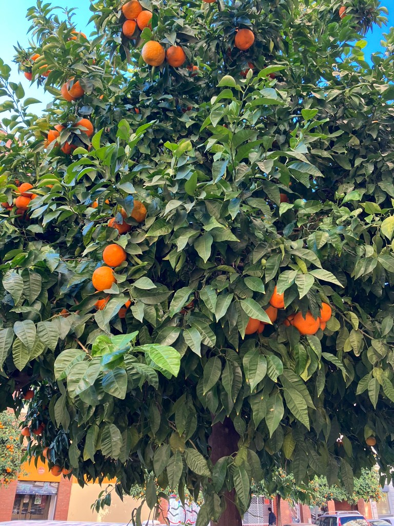 Seville Oranges are bitter, hence why they stay hanging on the trees all over Seville because nobody bothers to scrump them. They were brought over by the Muslims, primarily for their pleasant aroma and use in perfumes.