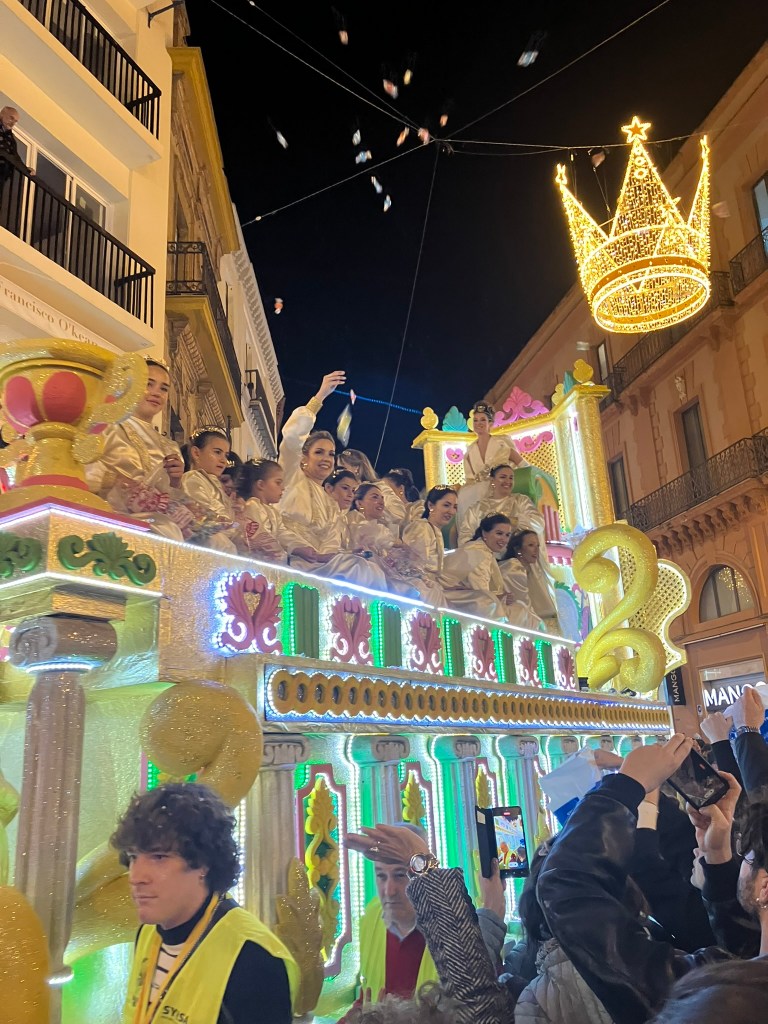 Another benefit of a post-Christmas visit was that we were there during Seville’s Epiphany parade on the 5th January. This celebrates the arrival of The Three Kings. It is a huge cavalcade of thirty-odd gaudy floats, the occupants of which sling out millions of sweets to the thousands of people lining the streets with their goody-bags at the ready.